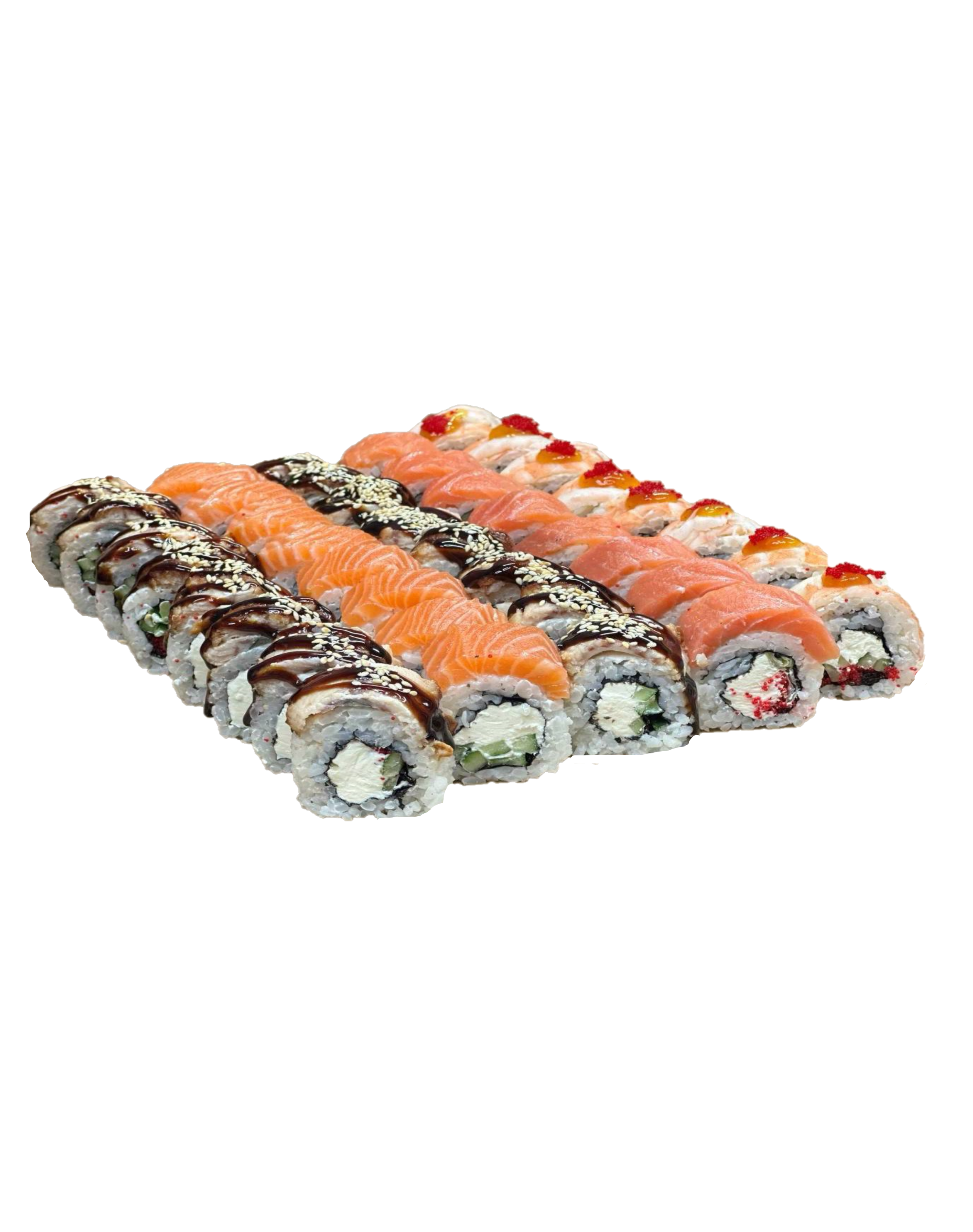 Склад: Лосось, креветка, сир, огірок, ікра. МасагоКкал: 138 ккал на 100 г.Вага: 295 г.